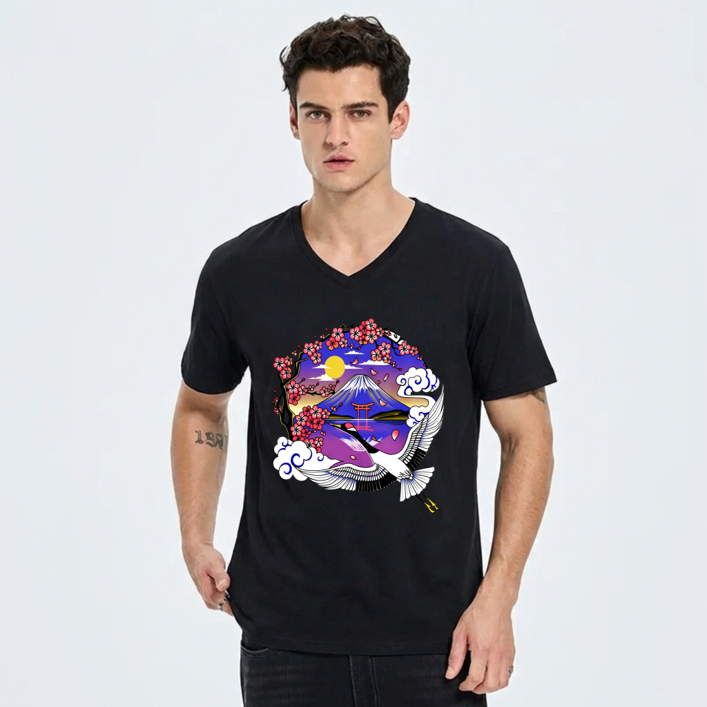 Japanese Crane Art Print T Shirt Men Women Black V Neck Casual Top